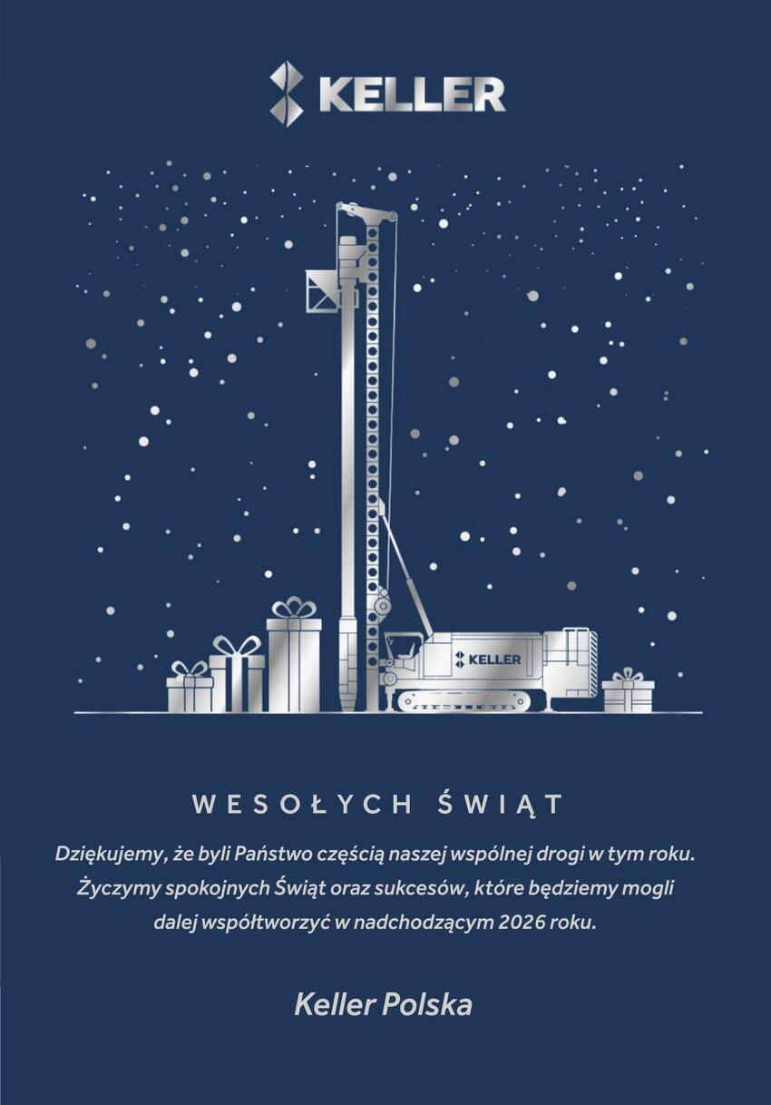 Wesołych Świąt od Keller Polska! Zbliżający się czas Świąt Bożego Narodzenia to wyjątkowy moment, aby zatrzymać się na chwilę, spojrzeć wstecz i podziękować za wspólną drogę w mijającym roku. Dziękujemy wszystkim naszym Partnerom, Klientom i Współpracownikom za zaufanie, współpracę i inspirujące projekty, które razem realizowaliśmy. Niech te Święta będą pełne spokoju, radości i rodzinnego ciepła. Życzymy, aby nadchodzący 2026 rok przyniósł nowe możliwości, ambitne wyzwania i sukcesy, które będziemy mogli wspólnie tworzyć. Razem budujemy solidne fundamenty – nie tylko w gruncie, ale i w relacjach. Do zobaczenia w Nowym Roku! Zespół Keller Polska.