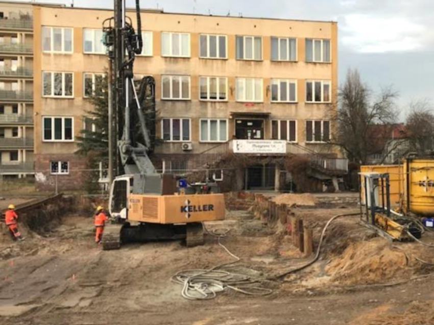 Zamiana projektowana długich mikropali wykonywanych w bardzo zagęszczonych piaskach na krótkie kolumny iniekcyjne. Głównym wyzwaniem było praca przy czynnym budynku szkoły oraz w przestrzeni ograniczonej ściankami szczelnymi.